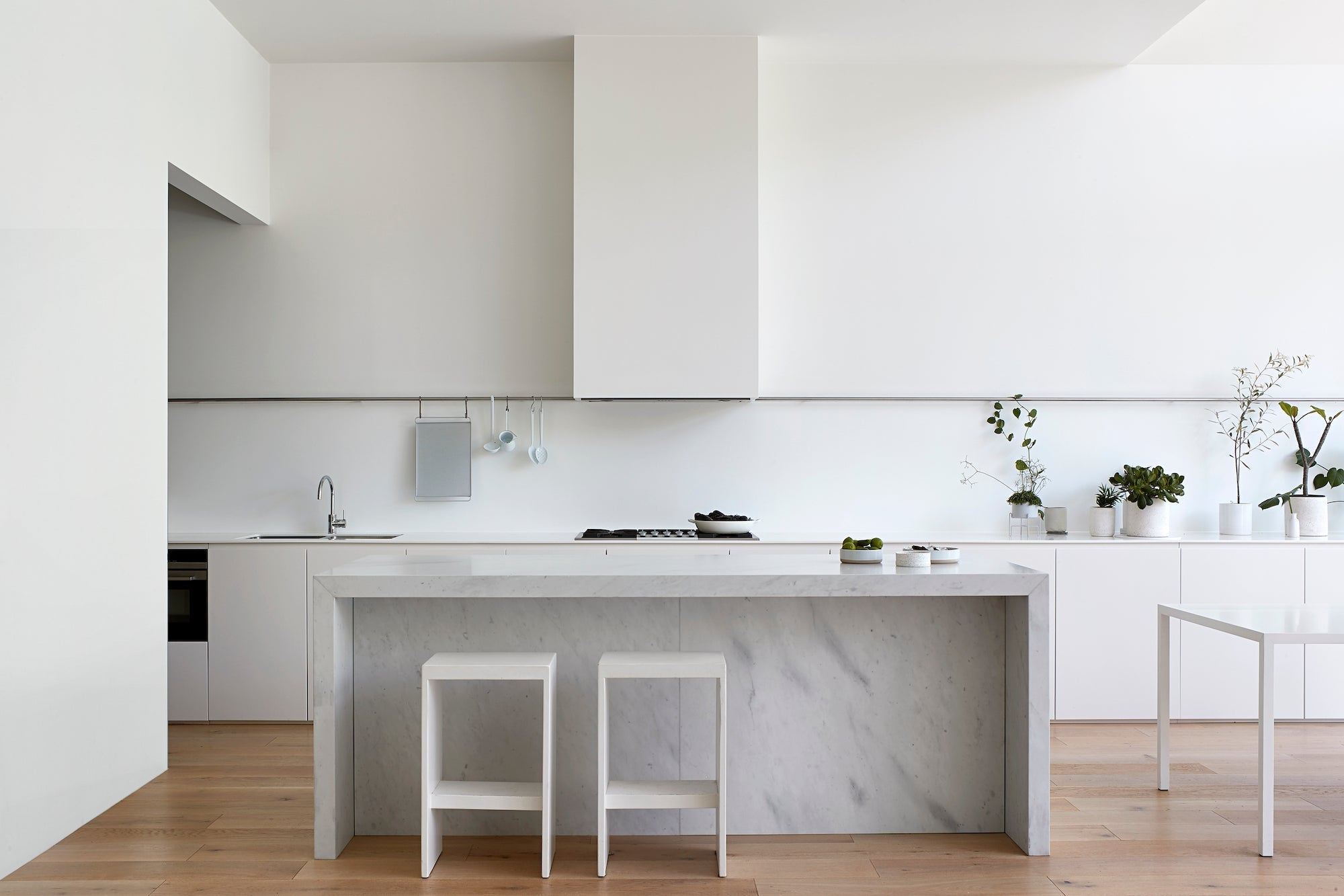 The natural European Oak grain of the floors add a layer of texture to the monochromatic interiors and creates a cohesive style throughout the home.