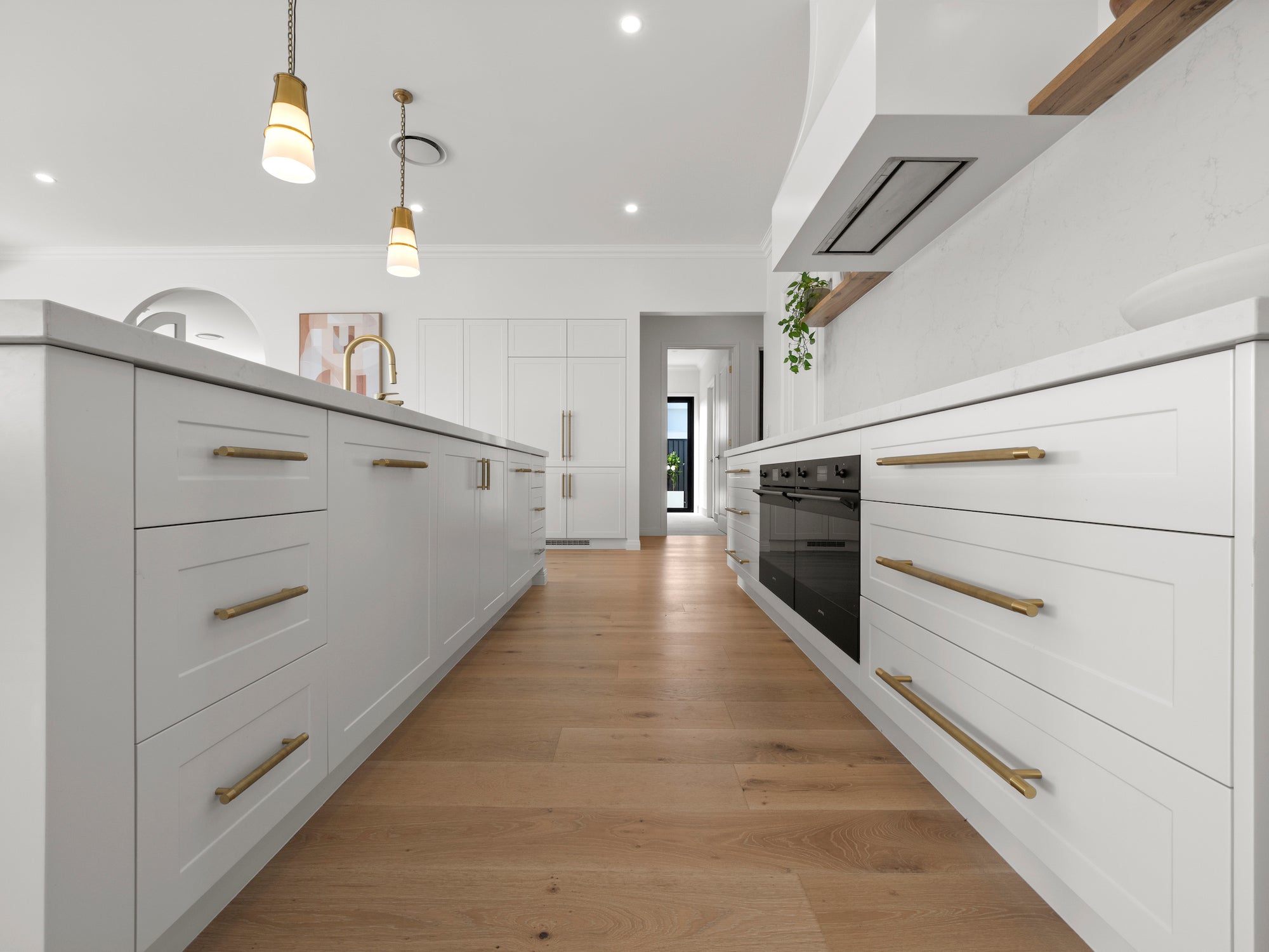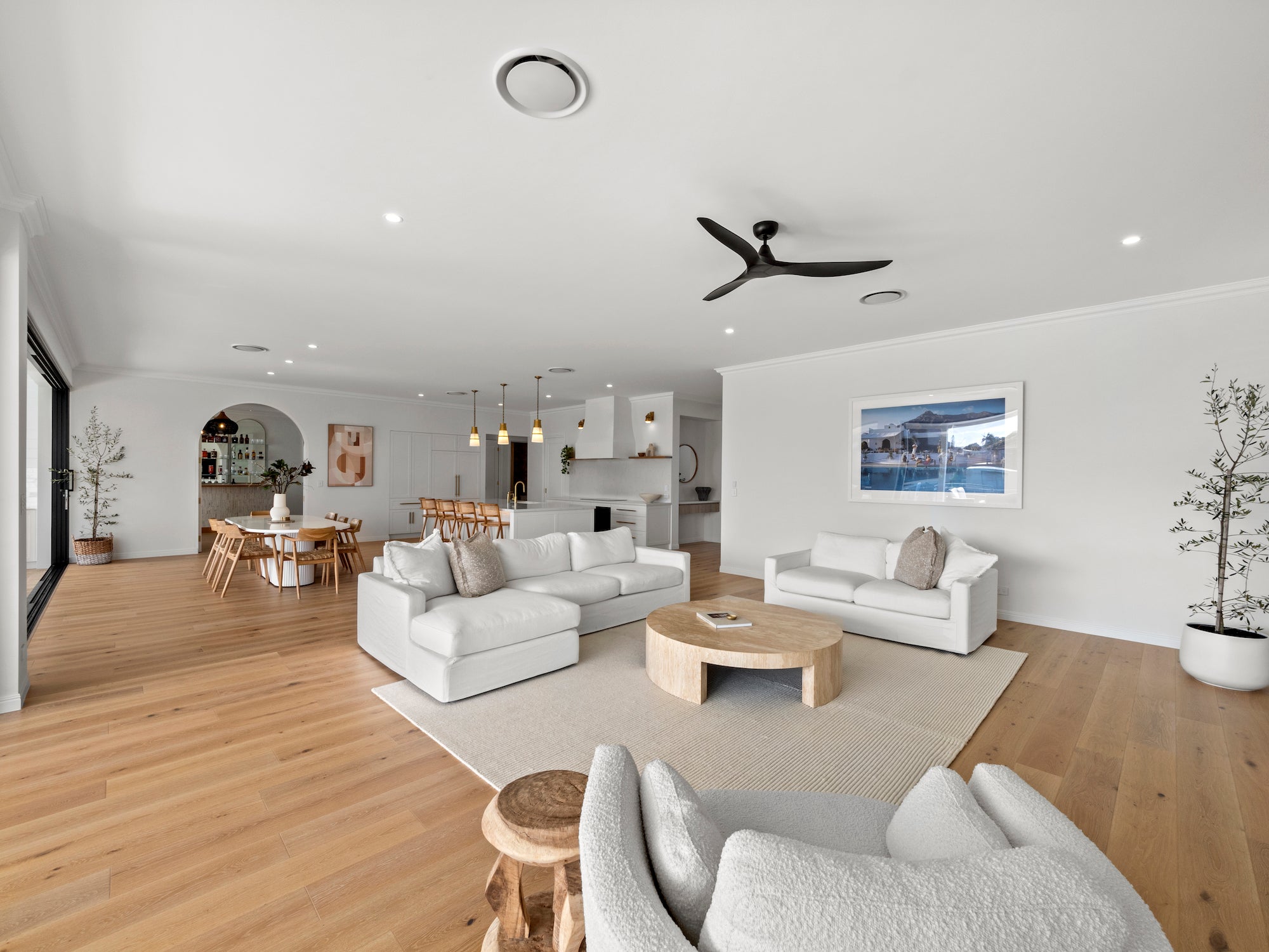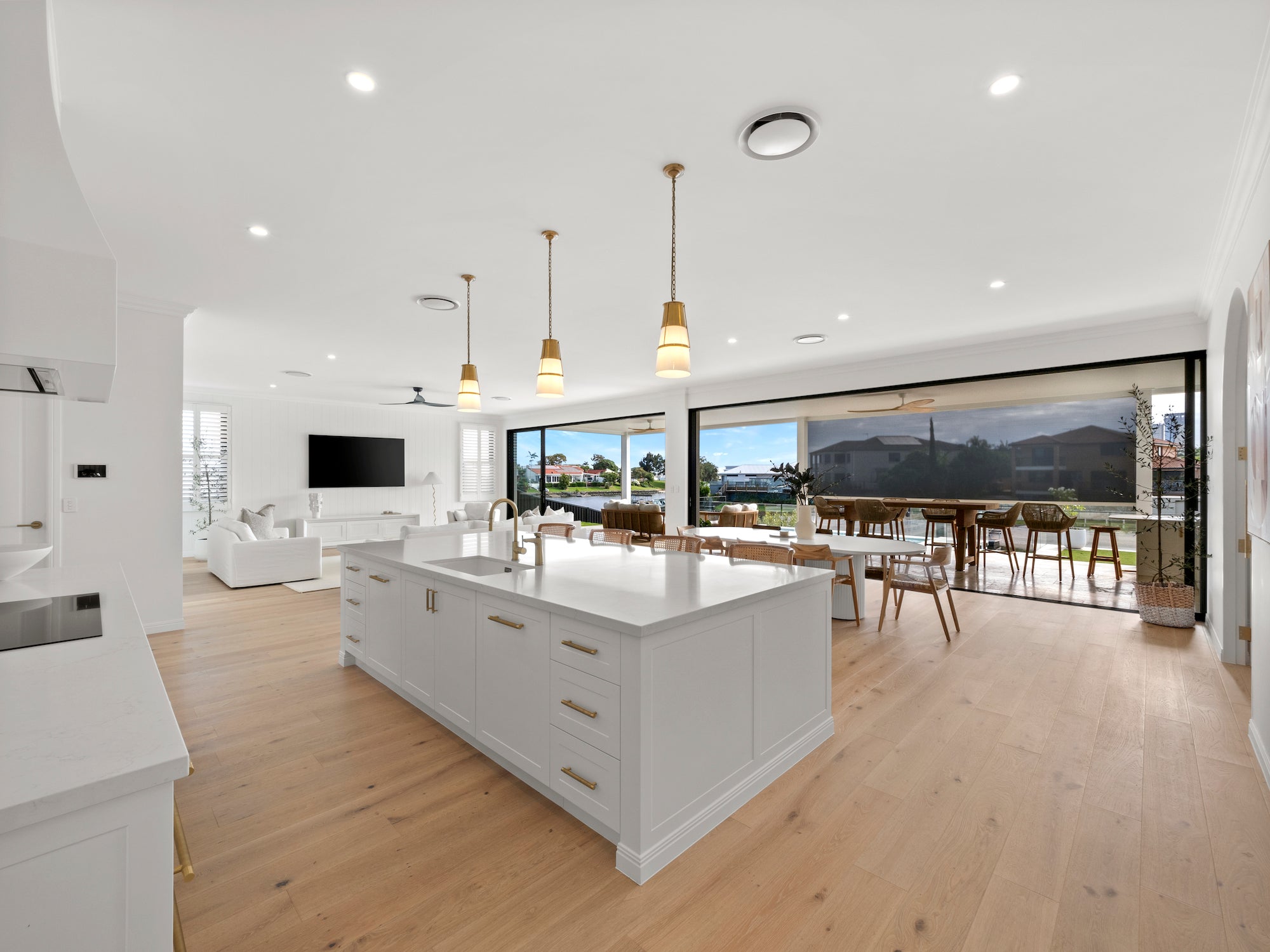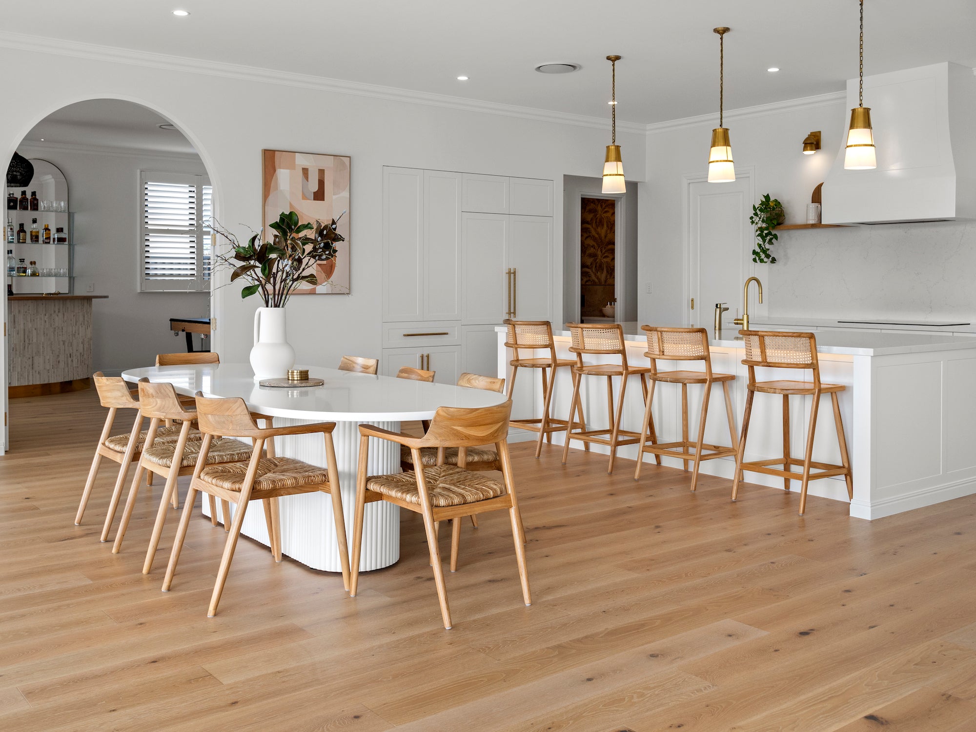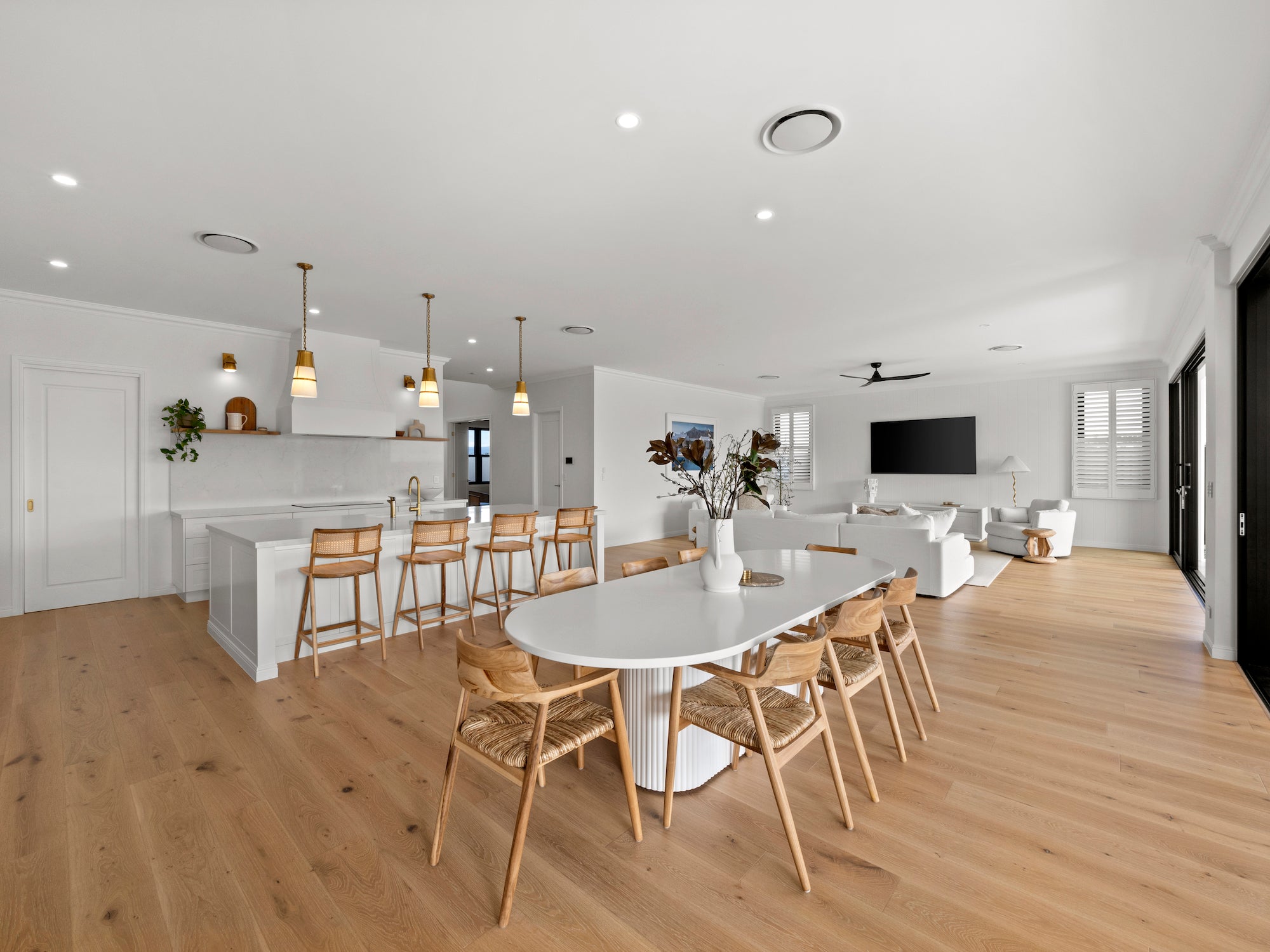 Adding warmth and timeless character to the space, Blonde Oak was the ideal choice for a serene Hampton style aesthetic. The home boasts an open plan living, dining, and kitchen area that extends to an outdoor entertaining space.